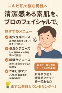 今回は、男性が抱えやすいお肌の悩みと、それを解決するための人気のメニューを、ご紹介します。
