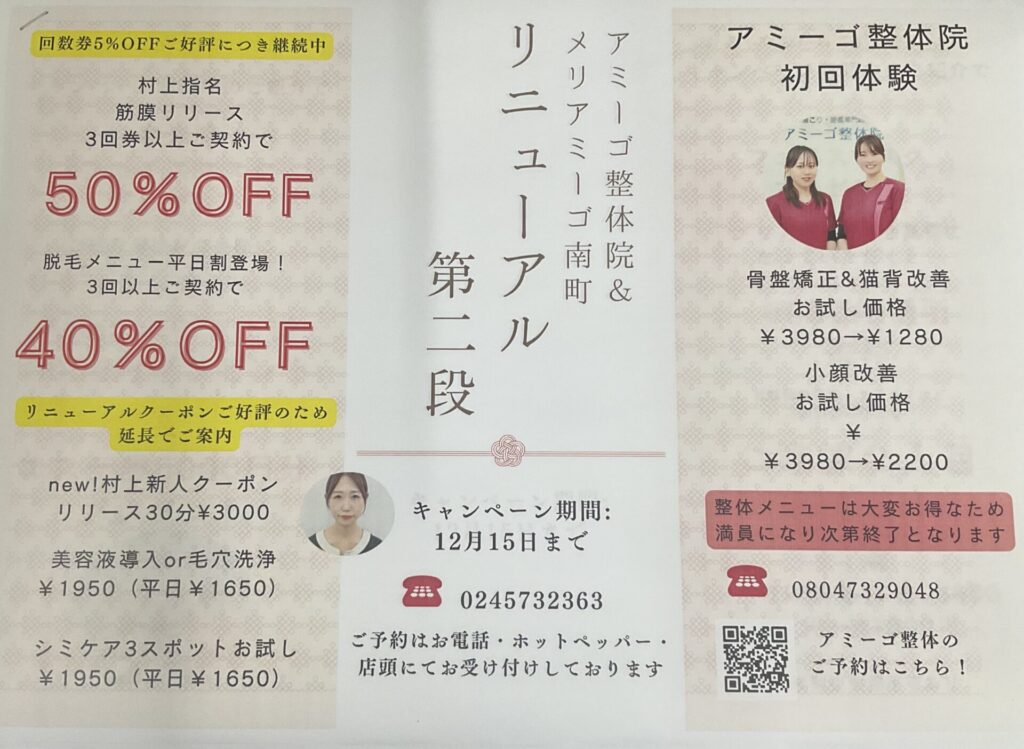 なんと、第二弾のキャンペーン実施中です!整体のメニューもめっちゃお得です。