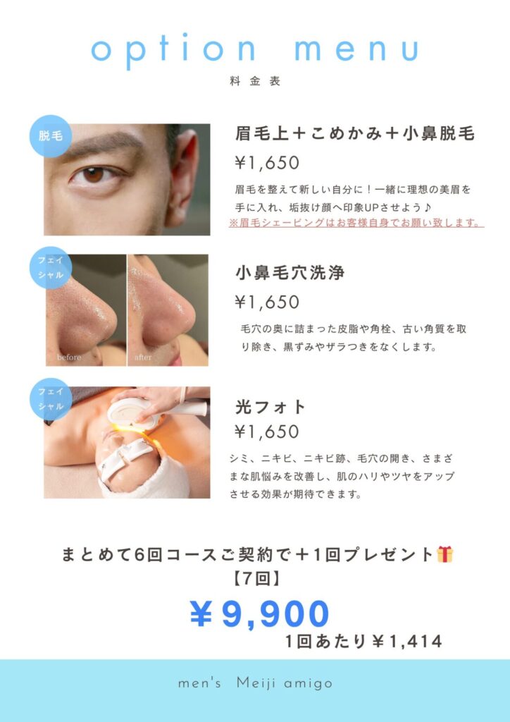 基本の部位以外の、眉毛上、こめかみ、小鼻の脱毛をご希望の方はオプションでお受けいたしております。